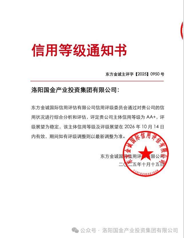 【大河财立方音书】10月17日,经东方金诚海外信用评估有限公司抽象分析和评估,洛阳国金产业投资集团有限公司获评AA+主体信用等第赌钱赚钱app,评级洽商为“自如”。