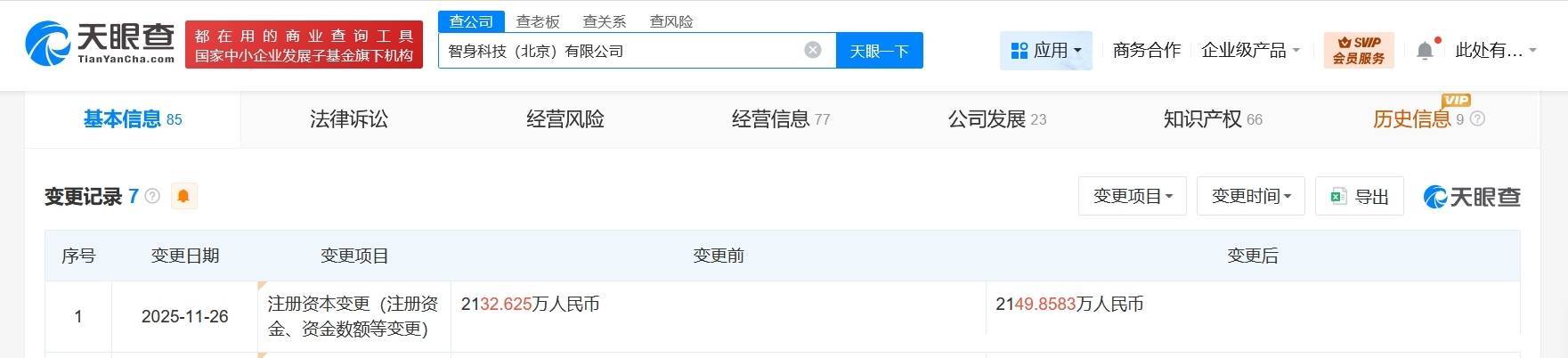【大河财立方音信】天眼查App深入,近日,智身科技(北京)有限公司发生工商变更,新增智元机器东说念主关联公司智元改进(上海)科技股份有限公司为鞭策。同期,注册老本由约2132.6万东说念主民币增至约2149.9万东说念主民币。