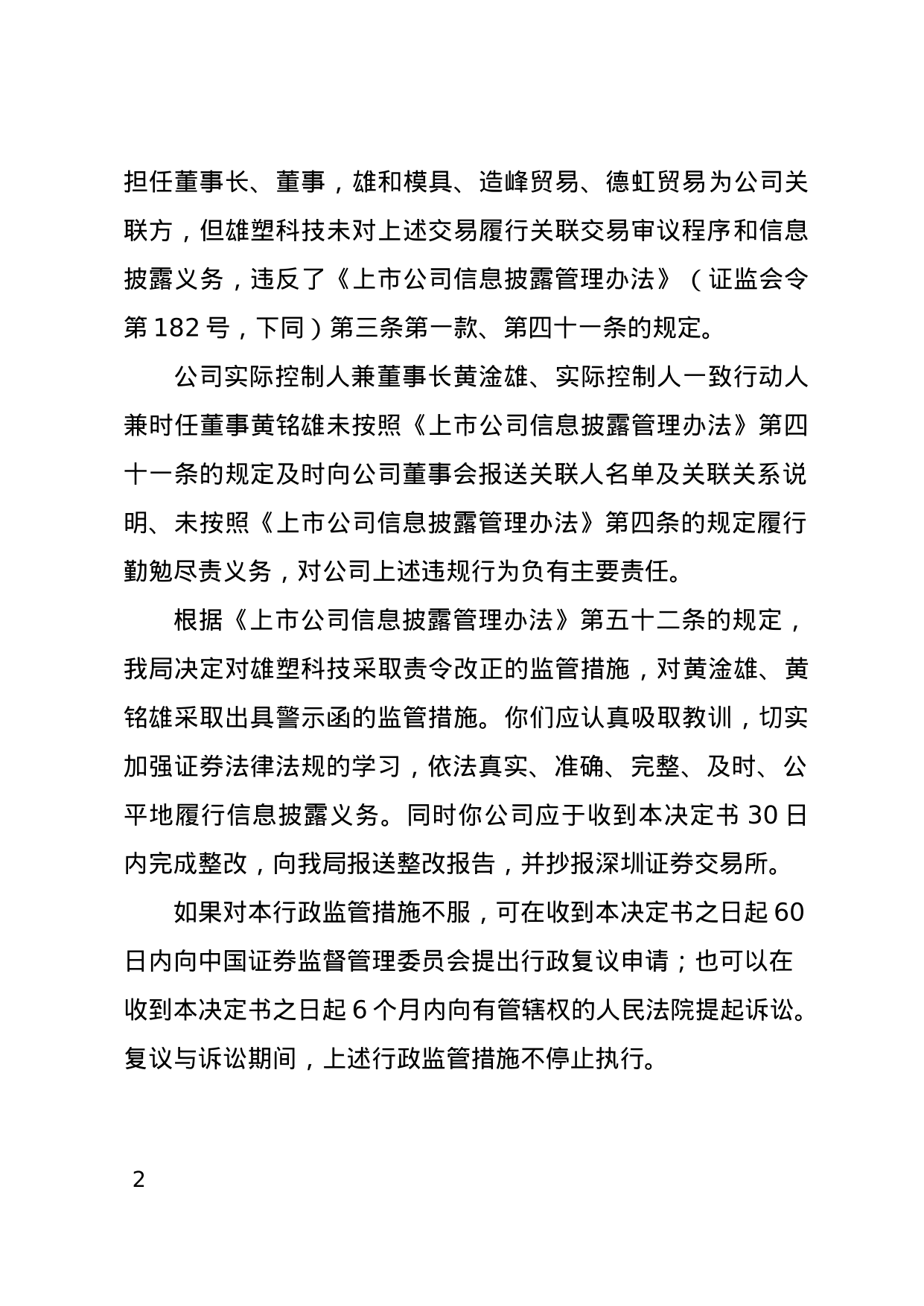 雄和模具,造峰买卖,德虹买卖注册资金或部分营运资金来自于黄淦雄,黄铭雄。黄淦雄,黄铭雄为雄塑科技本色甘休东说念主及一致活动东说念主,并在公司担任董事长,董事,雄和模具,造峰买卖,德虹买卖为公司干系方,但雄塑科技未对上述交游施行干系交游审议设施和信息显露义务,违背了《上市公司信息显露解决目的》的法例。