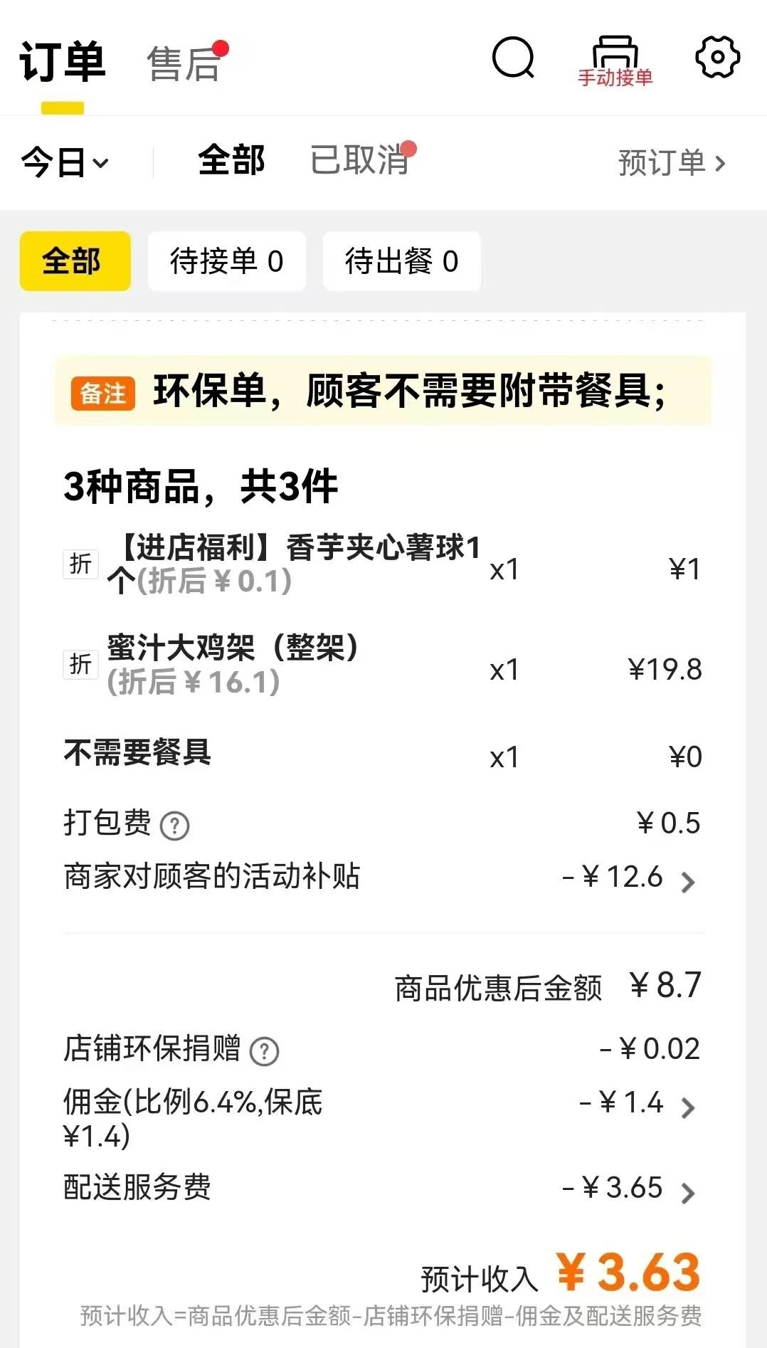 另一位北京单体餐饮商家给到中国新闻周刊的截图自满,其店内订价19.8元的鸡架,在外卖平台上折后只须16.1元,再扣掉给平台的1.4元佣金(佣金比例6.4%)和3.65元配送办事费,以及给用户补贴的12.6元等,我方施行收入惟一3.63元。