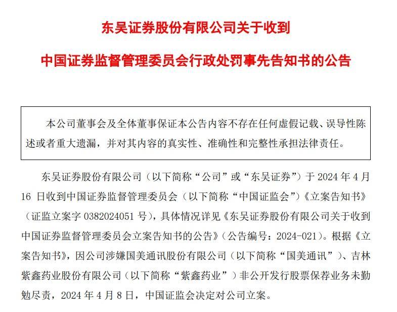 4月份,东吴证券因涉嫌国好意思通信、紫鑫药业非公确立行股票保荐业务未勤快尽职,收到了来自证监会的立案奉告书。时隔近7个月后,东吴证券的处罚终于落地。日前,东吴证券发布公告称,已收到来自证监会的《行政处罚奉告书》。